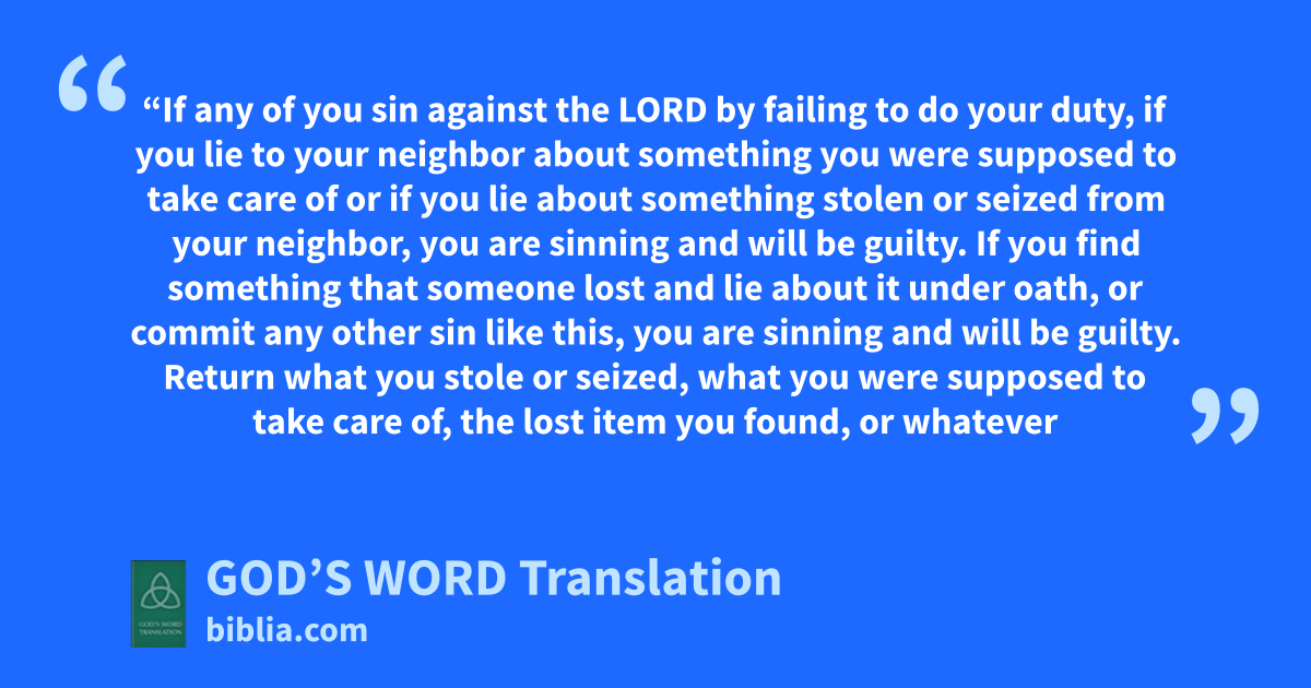 1 The Lord spoke to Moses, 2 “If any of you sin against the Lord by failing to do your duty, if you lie to your neighbor about something you were supposed to take care of or if you lie about something stolen or seized from your neighbor, you are sinning and will be guilty. 3 If you find something that someone lost and lie about it under oath, or commit any other sin like this, 4 you are sinning and will be guilty. Return what you stole or seized, what you were supposed to take care of, the lost item you found, 5 or whatever it was that you swore falsely about. Pay it back in full plus one-fifth more. Give it back to its owner on the day you bring your guilt offering. 6 Then bring the Lord your guilt offering, a ram that has no defects or its value in money. Bring it to the priest. 7 So the priest will make peace with the Lord. Then you will be forgiven for whatever you did that made you guilty.”
