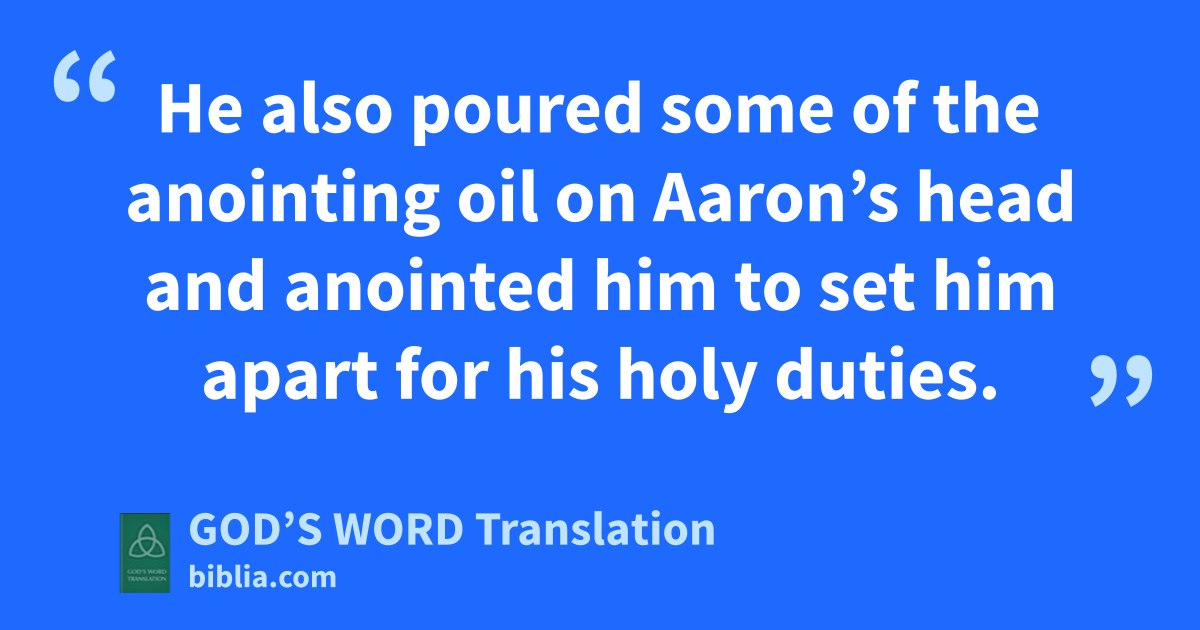 12 He also poured some of the anointing oil on Aaron’s head and anointed him to set him apart for his holy duties.
