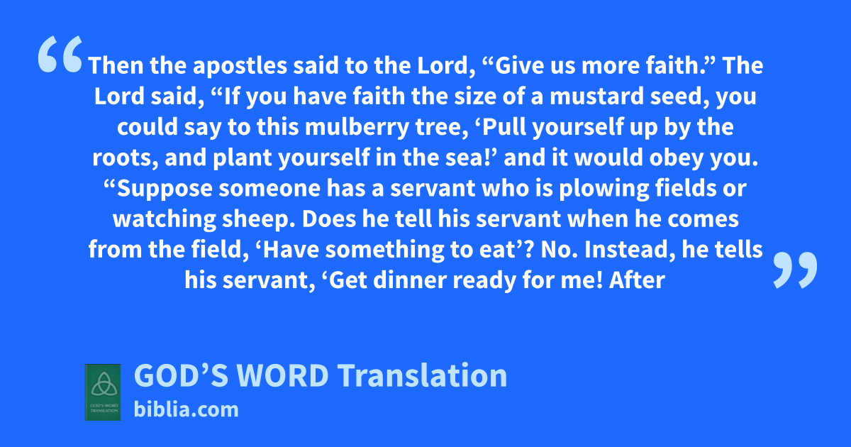 6 The Lord said, “If you have faith the size of a mustard seed, you could say to this mulberry tree, ‘Pull yourself up by the roots, and plant yourself in the sea!’ and it would obey you.