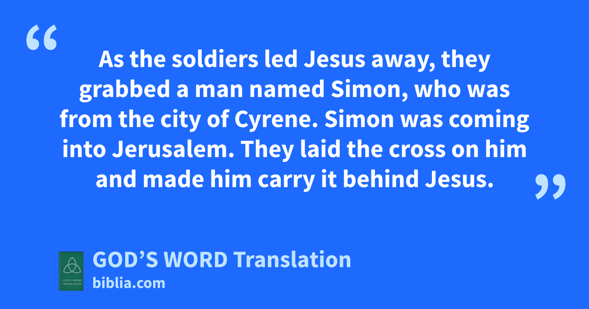 26 As the soldiers led Jesus away, they grabbed a man named Simon, who was from the city of Cyrene. Simon was coming into Jerusalem. They laid the cross on him and made him carry it behind Jesus.
