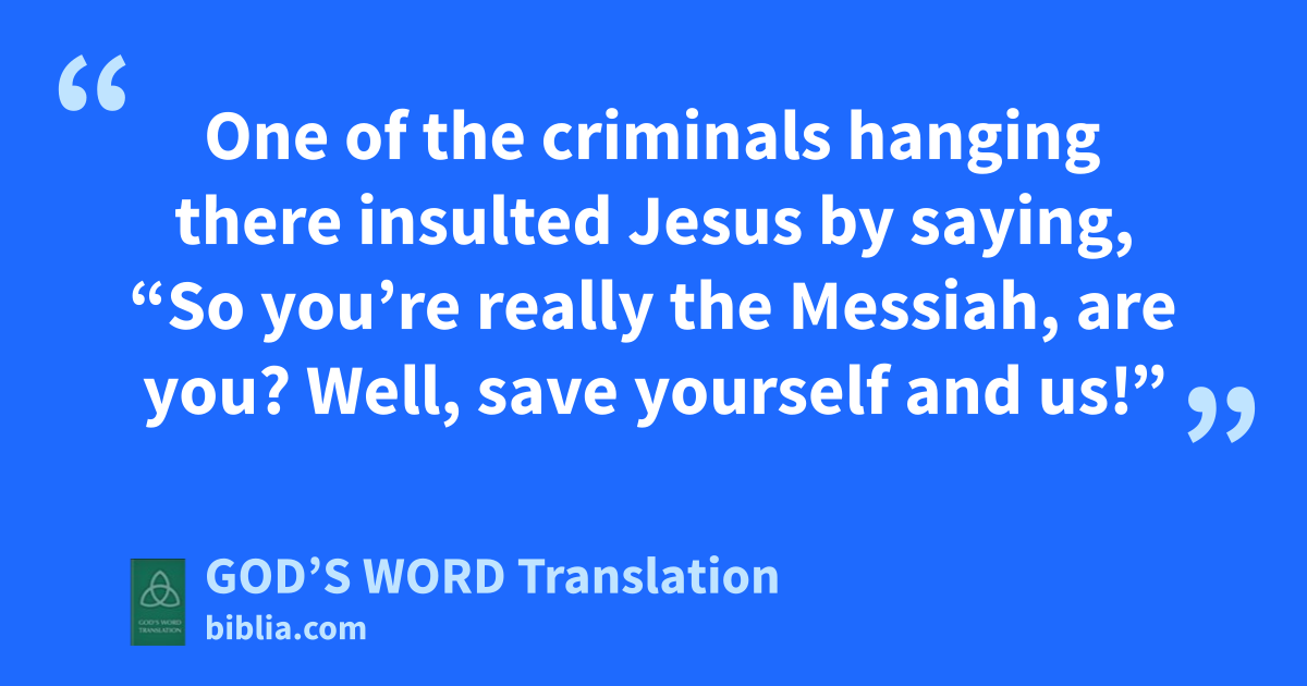 39 One of the criminals hanging there insulted Jesus by saying, “So you’re really the Messiah, are you? Well, save yourself and us!”