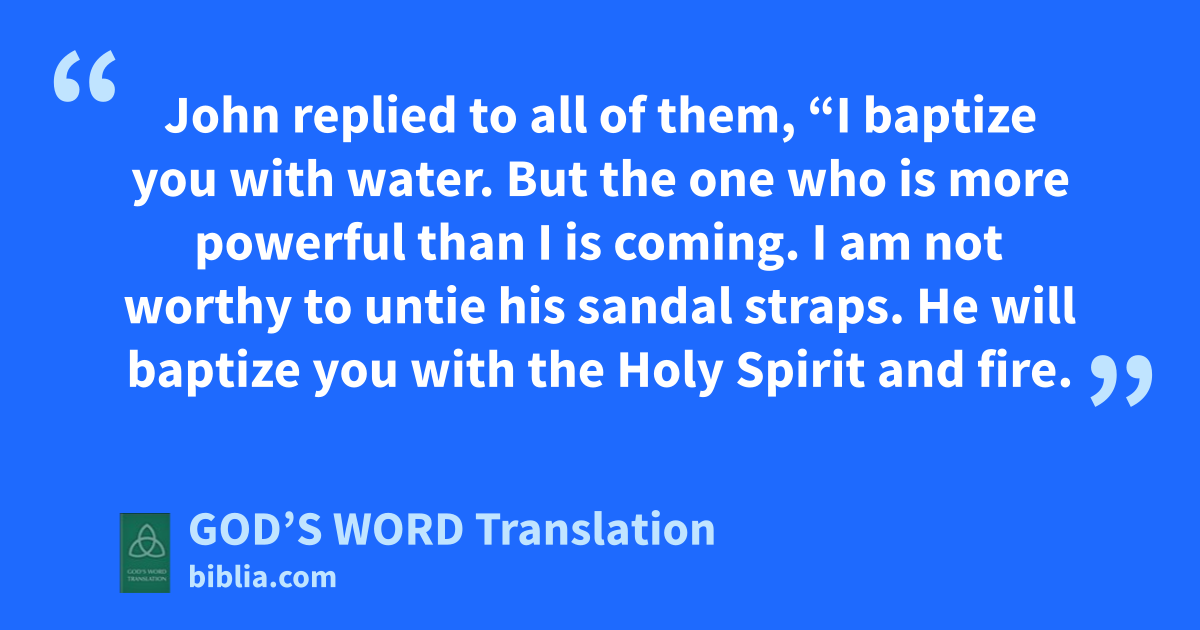15 People’s hopes were rising as they all wondered whether John was the Messiah. 16 John replied to all of them, “I baptize you with water. But the one who is more powerful than I is coming. I am not worthy to untie his sandal straps. He will baptize you with the Holy Spirit and fire. 17 His winnowingb shovel is in his hand to clean up his threshing floor.c He will gather the wheat into his barn, but he will burn the husks in a fire that can never be put out.”