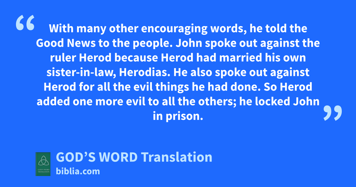 19 John spoke out against the ruler Herod because Herod had married his own sister-in-law, Herodias. He also spoke out against Herod for all the evil things he had done. 20 So Herod added one more evil to all the others; he locked John in prison.