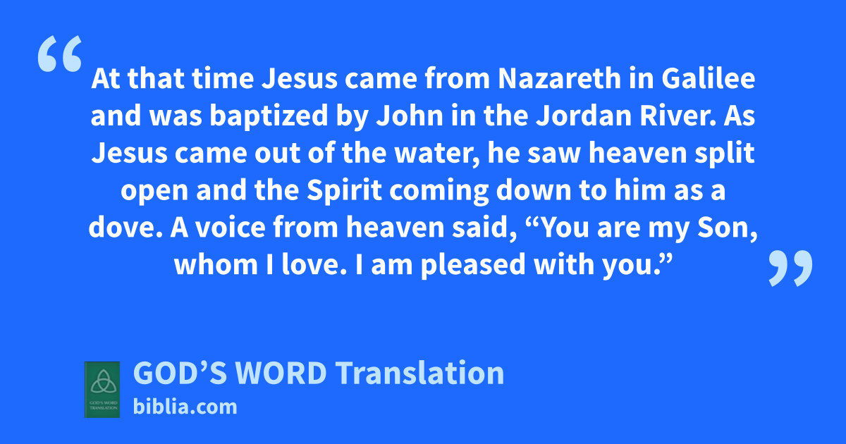 9 At that time Jesus came from Nazareth in Galilee and was baptized by John in the Jordan River. 10 As Jesus came out of the water, he saw heaven split open and the Spirit coming down to him as a dove. 11 A voice from heaven said, “You are my Son, whom I love. I am pleased with you.”