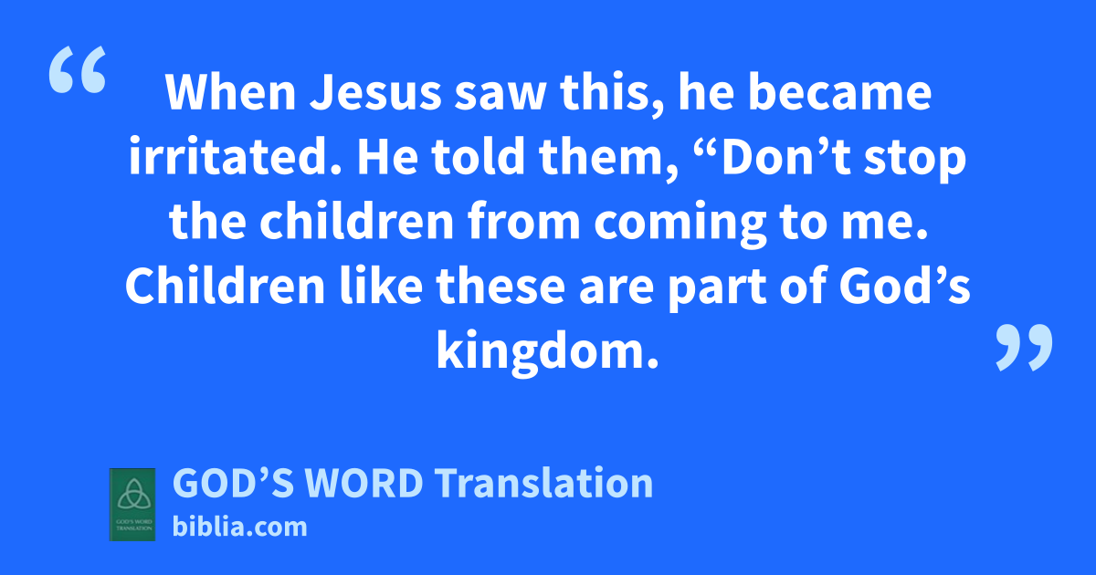 14 When Jesus saw this, he became irritated. He told them, “Don’t stop the children from coming to me. Children like these are part of God’s kingdom. 15 I can guarantee this truth: Whoever doesn’t receive God’s kingdom as a little child receives it will never enter it.”