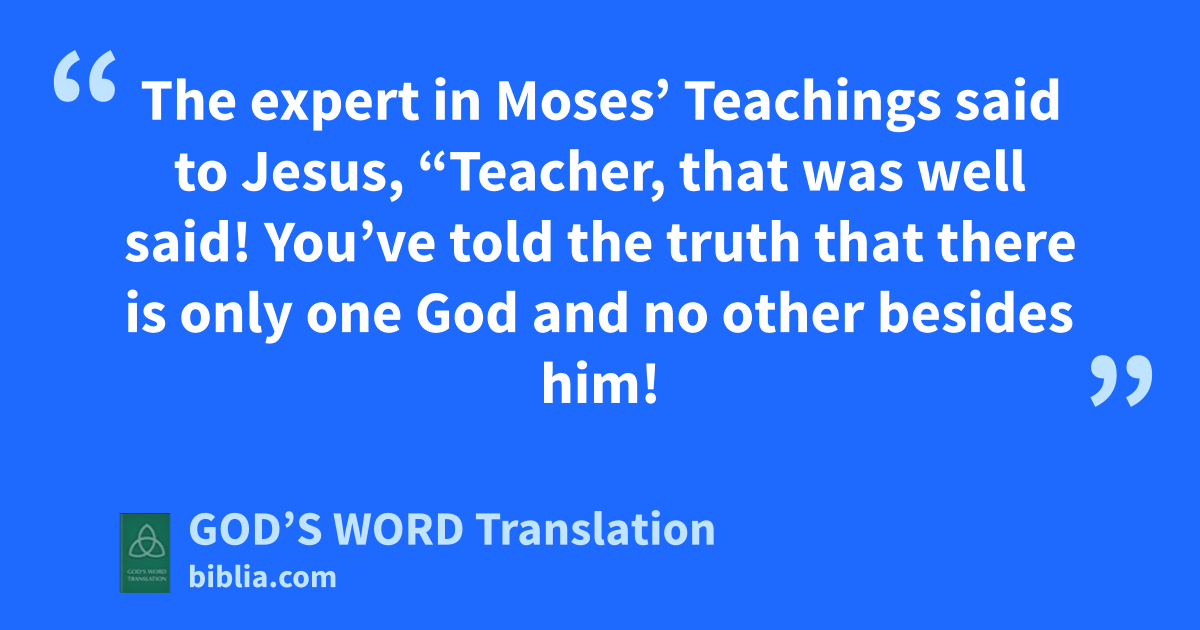 32 The expert in Moses’ Teachings said to Jesus, “Teacher, that was well said! You’ve told the truth that there is only one God and no other besides him! 33 To love him with all your heart, with all your understanding, with all your strength, and to love your neighbor as you love yourself is more important than all the burnt offerings and sacrifices.”