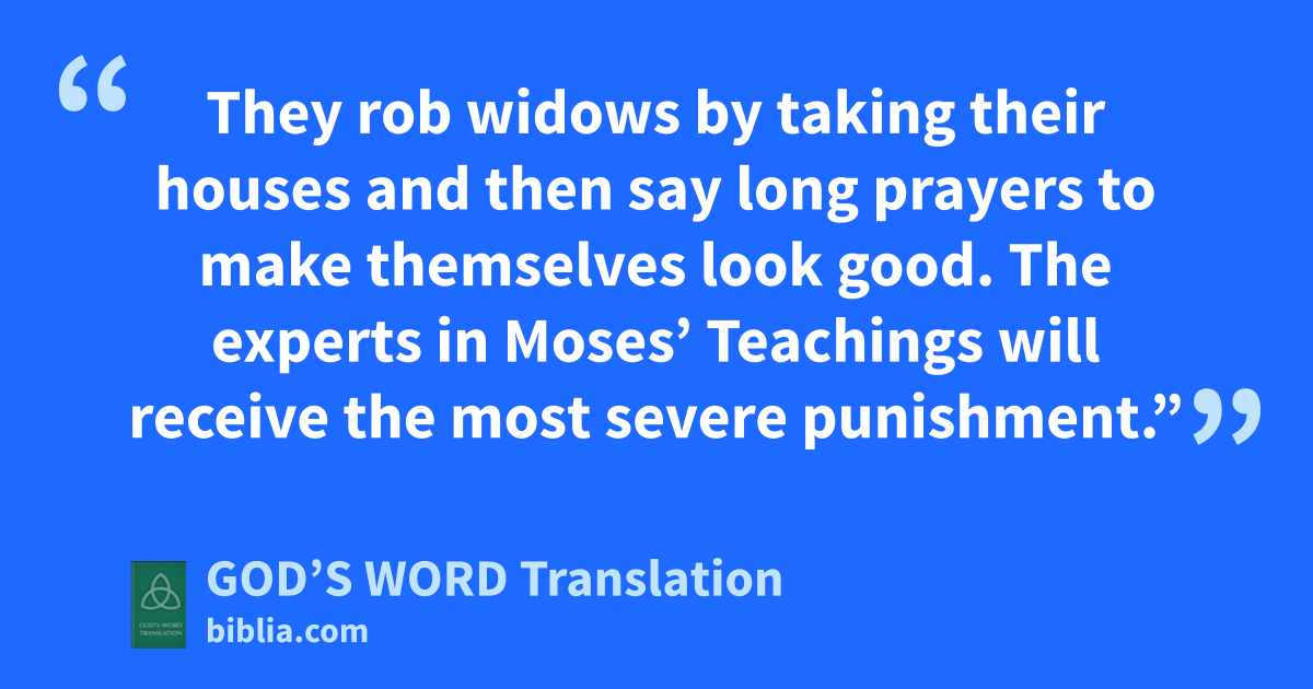 The large crowd enjoyed listening to him. 38 As he taught, he said, “Watch out for the experts in Moses’ Teachings! They like to walk around in long robes, to be greeted in the marketplaces, 39 and to have the front seats in synagogues and the places of honor at dinners. 40 They rob widows by taking their houses and then say long prayers to make themselves look good. The experts in Moses’ Teachings will receive the most severe punishment.”