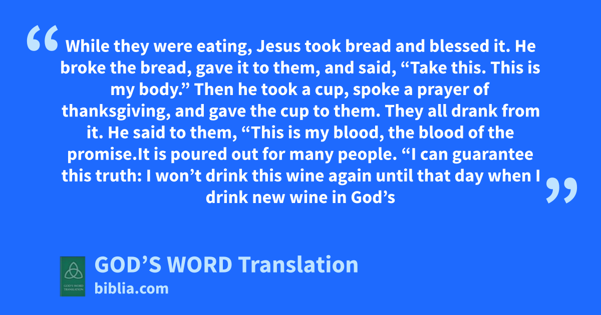 23 Then he took a cup, spoke a prayer of thanksgiving, and gave the cup to them. They all drank from it. 24 He said to them, “This is my blood, the blood of the promise.a It is poured out for many people.