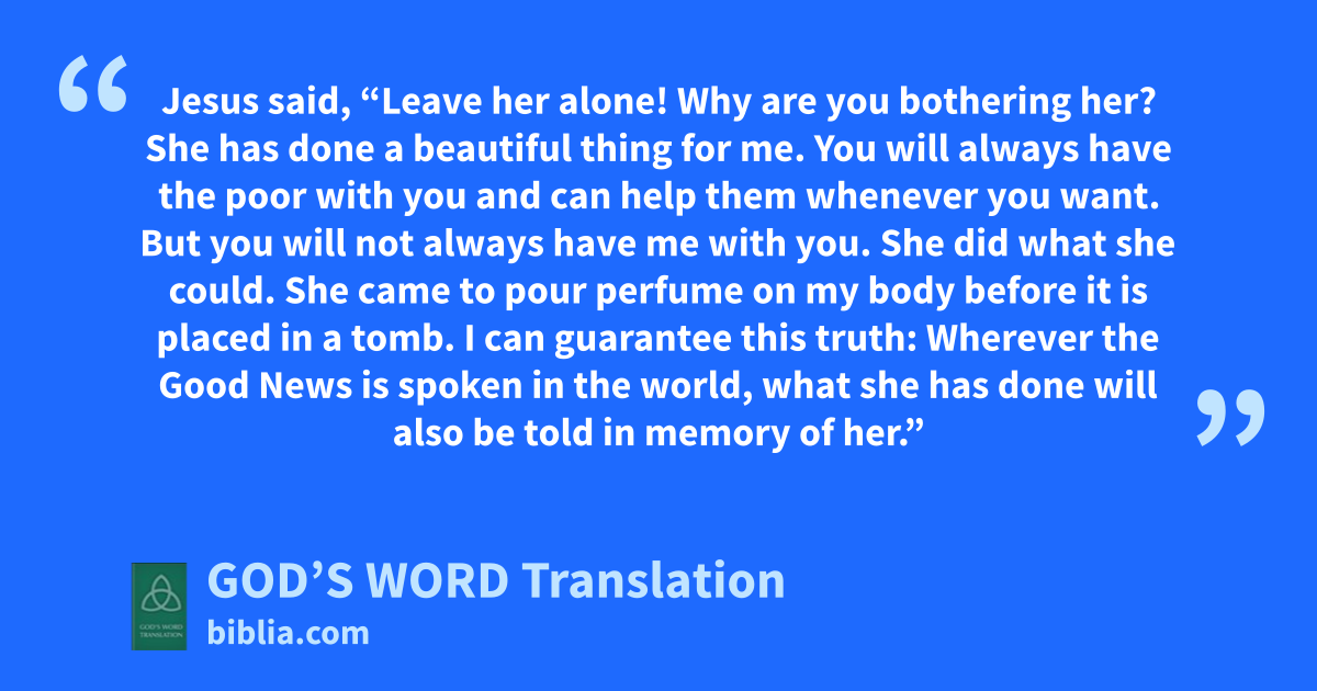 6 Jesus said, “Leave her alone! Why are you bothering her? She has done a beautiful thing for me. 7 You will always have the poor with you and can help them whenever you want. But you will not always have me with you. 8 She did what she could. She came to pour perfume on my body before it is placed in a tomb. 9 I can guarantee this truth: Wherever the Good News is spoken in the world, what she has done will also be told in memory of her.”