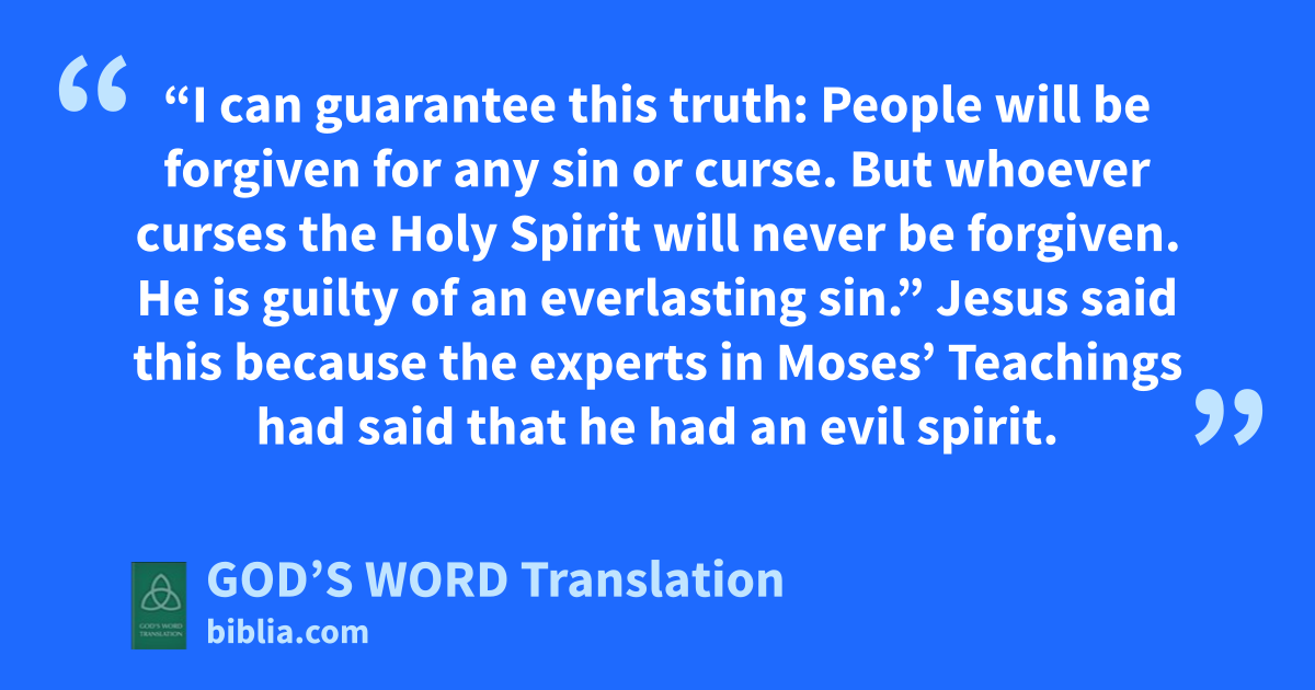 28 “I can guarantee this truth: People will be forgiven for any sin or curse. 29 But whoever curses the Holy Spirit will never be forgiven. He is guilty of an everlasting sin.” 30 Jesus said this because the experts in Moses’ Teachings had said that he had an evil spirit.