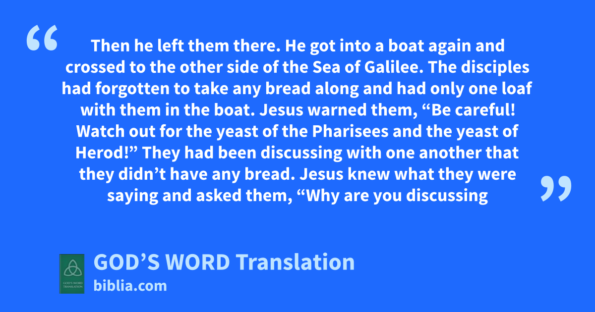 He got into a boat again and crossed to the other side of the Sea of Galilee. 14 The disciples had forgotten to take any bread along and had only one loaf with them in the boat.
