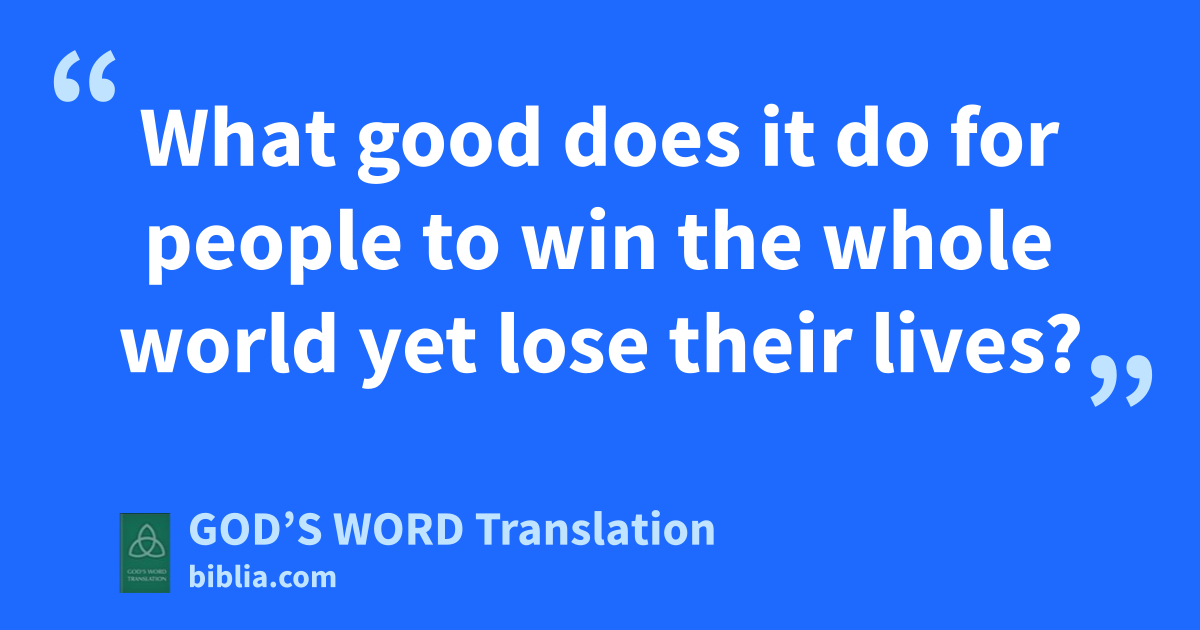34 Then Jesus called the crowd to himself along with his disciples. He said to them, “Those who want to follow me must say no to the things they want, pick up their crosses, and follow me. 35 Those who want to save their lives will lose them. But those who lose their lives for me and for the Good News will save them. 36 What good does it do for people to win the whole world yet lose their lives? 37 Or what should a person give in exchange for life? 38 If people are ashamed of me and what I say in this unfaithful and sinful generation, the Son of Man will be ashamed of those people when he comes with the holy angels in his Father’s glory.”