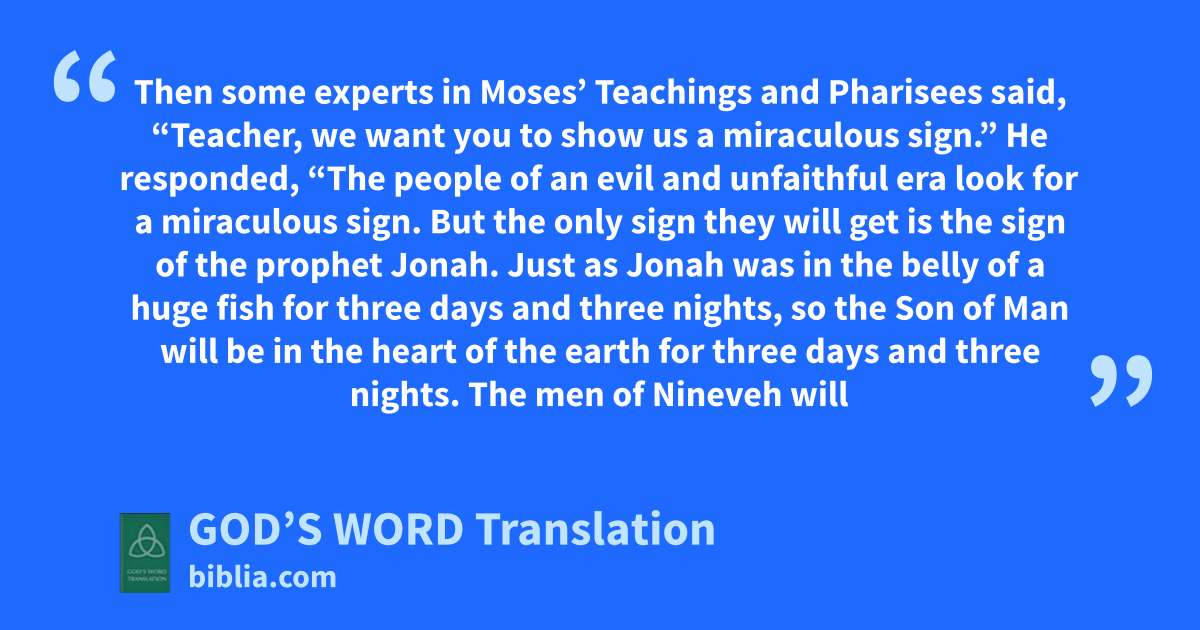 39 He responded, “The people of an evil and unfaithful era look for a miraculous sign. But the only sign they will get is the sign of the prophet Jonah. 40 Just as Jonah was in the belly of a huge fish for three days and three nights, so the Son of Man will be in the heart of the earth for three days and three nights. 41 The men of Nineveh will stand up with you at the time of judgment and will condemn you, because they turned to God and changed the way they thought and acted when Jonah spoke his message. But look, someone greater than Jonah is here! 42 The queen from the south will stand up at the time of judgment with you. She will condemn you, because she came from the ends of the earth to hear Solomon’s wisdom. But look, someone greater than Solomon is here!