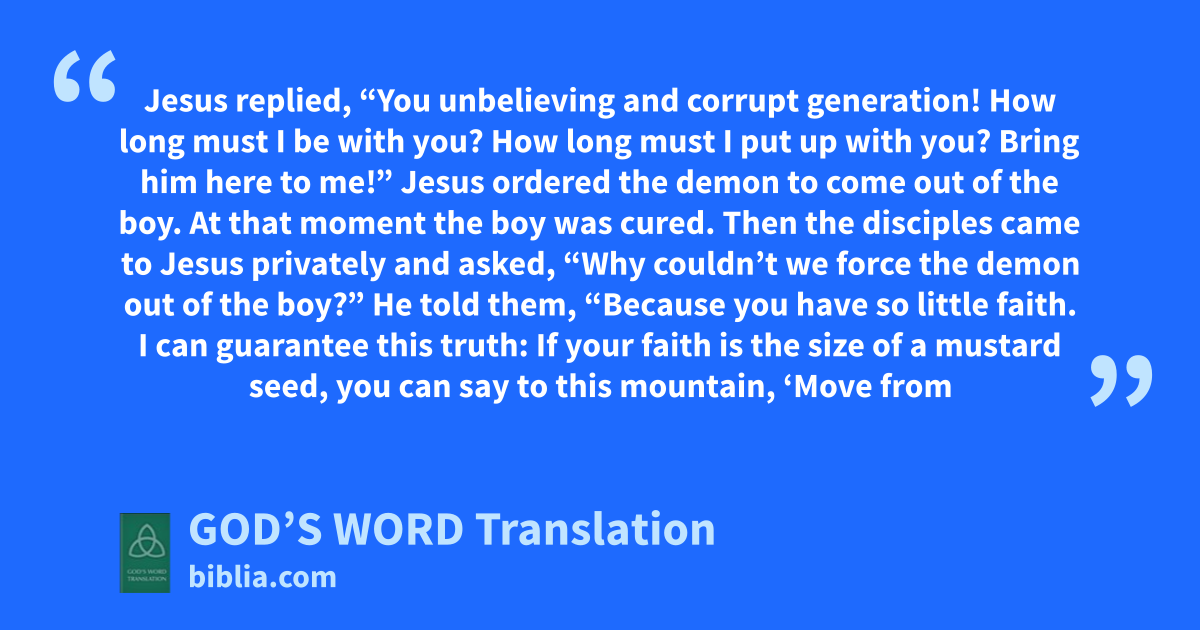 17 Jesus replied, “You unbelieving and corrupt generation! How long must I be with you? How long must I put up with you? Bring him here to me!”