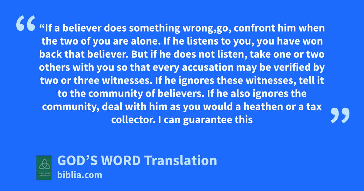 15 “If a believer does something wrong,b go, confront him when the two of you are alone. If he listens to you, you have won back that believer. 16 But if he does not listen, take one or two others with you so that every accusation may be verified by two or three witnesses. 17 If he ignores these witnesses, tell it to the community of believers. If he also ignores the community, deal with him as you would a heathen or a tax collector. 18 I can guarantee this truth: Whatever you imprison, God will imprison. And whatever you set free, God will set free.
