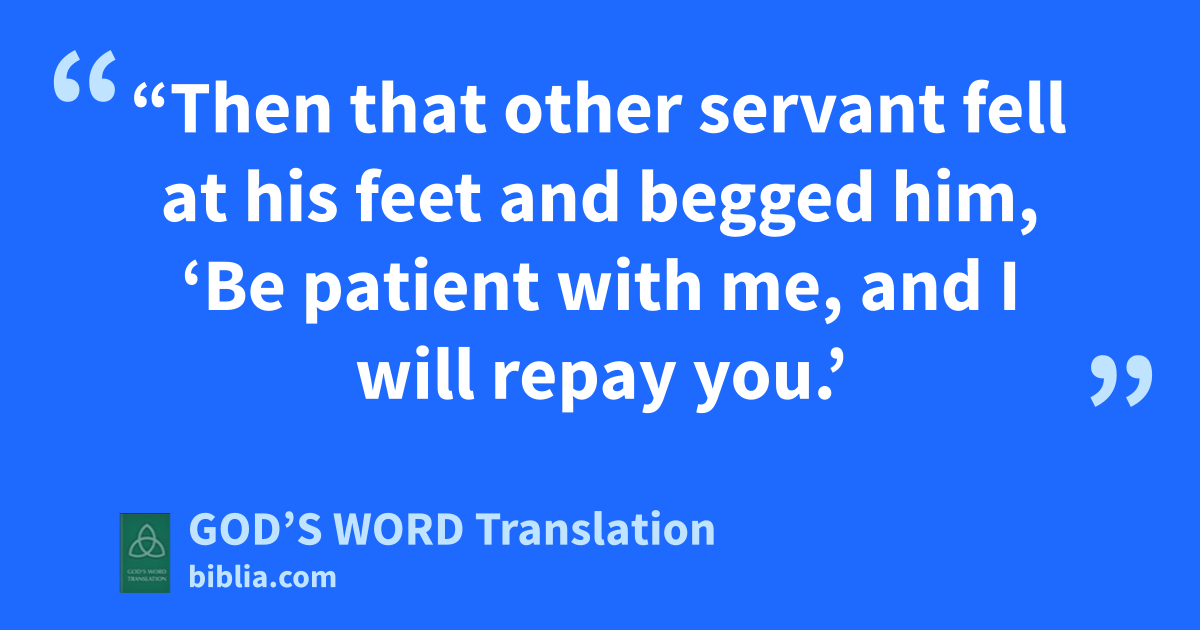 29 “Then that other servant fell at his feet and begged him, ‘Be patient with me, and I will repay you.’ 30 But he refused. Instead, he turned away and had that servant put into prison until he would repay what he owed.
