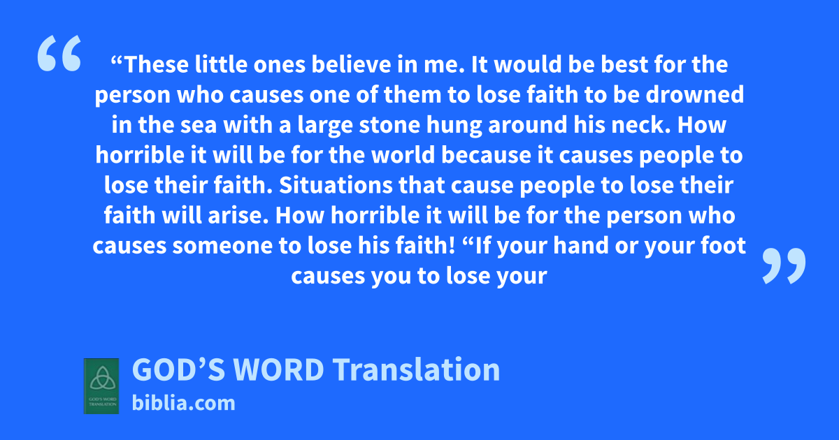 6 “These little ones believe in me. It would be best for the person who causes one of them to lose faith to be drowned in the sea with a large stone hung around his neck. 7 How horrible it will be for the world because it causes people to lose their faith. Situations that cause people to lose their faith will arise. How horrible it will be for the person who causes someone to lose his faith!