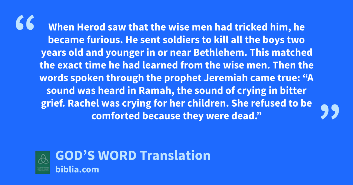 16 When Herod saw that the wise men had tricked him, he became furious. He sent soldiers to kill all the boys two years old and younger in or near Bethlehem. This matched the exact time he had learned from the wise men. 17 Then the words spoken through the prophet Jeremiah came true: