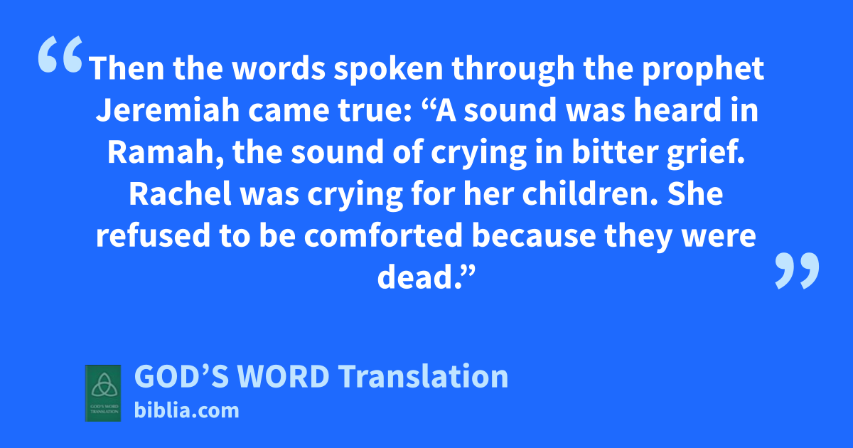 16 When Herod saw that the wise men had tricked him, he became furious. He sent soldiers to kill all the boys two years old and younger in or near Bethlehem. This matched the exact time he had learned from the wise men. 17 Then the words spoken through the prophet Jeremiah came true: