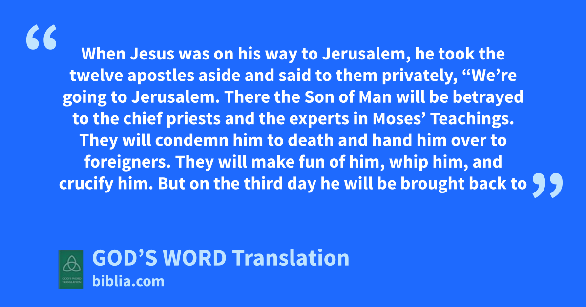 17 When Jesus was on his way to Jerusalem, he took the twelve apostles aside and said to them privately, 18 “We’re going to Jerusalem. There the Son of Man will be betrayed to the chief priests and the experts in Moses’ Teachings. They will condemn him to death 19 and hand him over to foreigners. They will make fun of him, whip him, and crucify him. But on the third day he will be brought back to life.”