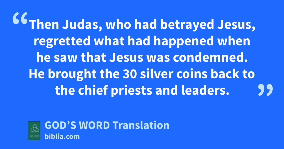 3 Then Judas, who had betrayed Jesus, regretted what had happened when he saw that Jesus was condemned. He brought the 30 silver coins back to the chief priests and leaders. 4 He said, “I’ve sinned by betraying an innocent man.”