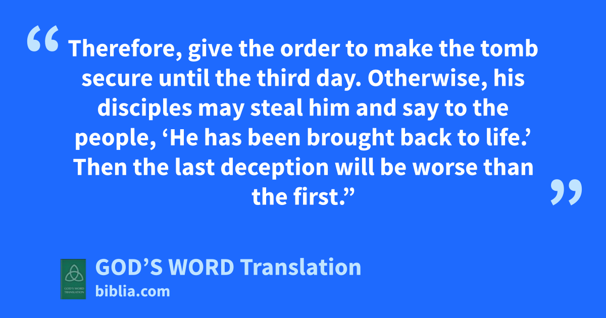 62 The next day, which was the day of rest—a holy day, the chief priests and Pharisees gathered together and went to Pilate. 63 They said, “Sir, we remember how that deceiver said while he was still alive, ‘After three days I will be brought back to life.’ 64 Therefore, give the order to make the tomb secure until the third day. Otherwise, his disciples may steal him and say to the people, ‘He has been brought back to life.’ Then the last deception will be worse than the first.”