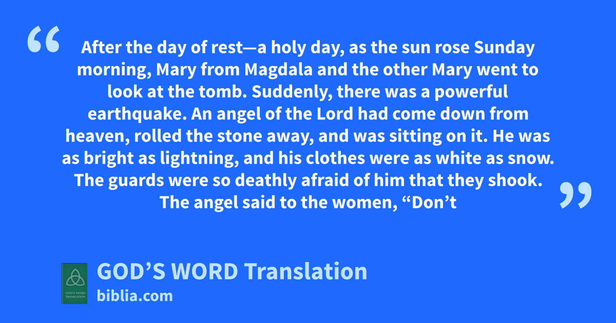 2 Suddenly, there was a powerful earthquake. An angel of the Lord had come down from heaven, rolled the stone away, and was sitting on it. 3 He was as bright as lightning, and his clothes were as white as snow. 4 The guards were so deathly afraid of him that they shook.