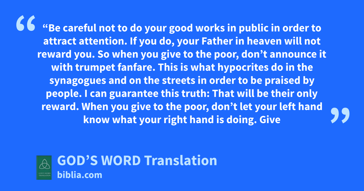 1 “Be careful not to do your good works in public in order to attract attention. If you do, your Father in heaven will not reward you. 2 So when you give to the poor, don’t announce it with trumpet fanfare. This is what hypocrites do in the synagogues and on the streets in order to be praised by people. I can guarantee this truth: That will be their only reward. 3 When you give to the poor, don’t let your left hand know what your right hand is doing. 4 Give your contributions privately. Your Father sees what you do in private. He will reward you.