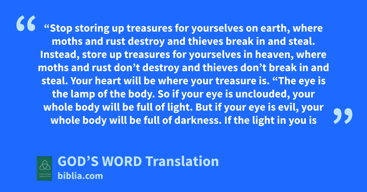 19 “Stop storing up treasures for yourselves on earth, where moths and rust destroy and thieves break in and steal. 20 Instead, store up treasures for yourselves in heaven, where moths and rust don’t destroy and thieves don’t break in and steal. 21 Your heart will be where your treasure is.