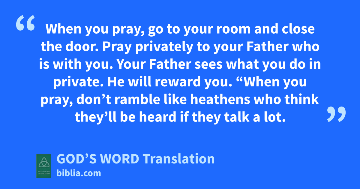 5 “When you pray, don’t be like hypocrites. They like to stand in synagogues and on street corners to pray so that everyone can see them. I can guarantee this truth: That will be their only reward. 6 When you pray, go to your room and close the door. Pray privately to your Father who is with you. Your Father sees what you do in private. He will reward you.