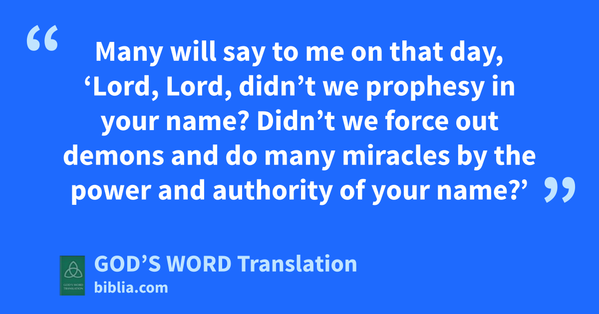 21 “Not everyone who says to me, ‘Lord, Lord!’ will enter the kingdom of heaven, but only the person who does what my Father in heaven wants. 22 Many will say to me on that day, ‘Lord, Lord, didn’t we prophesy in your name? Didn’t we force out demons and do many miracles by the power and authority of your name?’ 23 Then I will tell them publicly, ‘I’ve never known you. Get away from me, you evil people.’