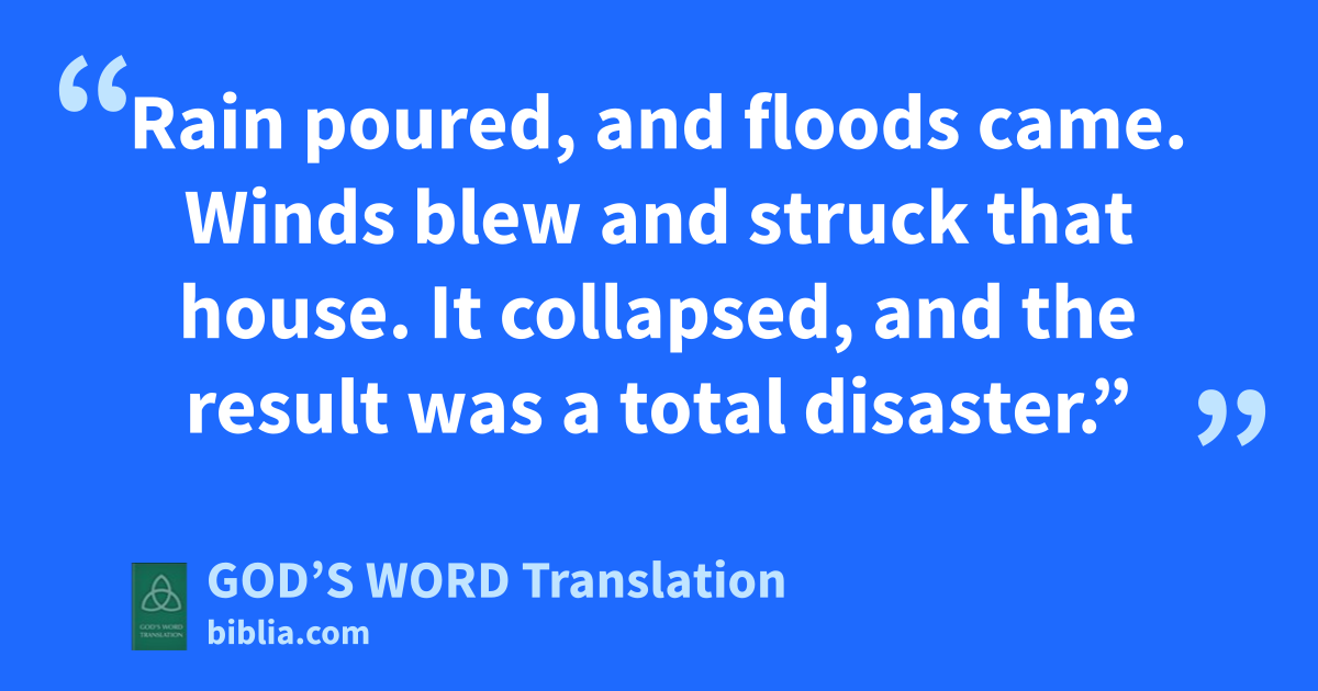26 “Everyone who hears what I say but doesn’t obey it will be like a foolish person who built a house on sand. 27 Rain poured, and floods came. Winds blew and struck that house. It collapsed, and the result was a total disaster.”