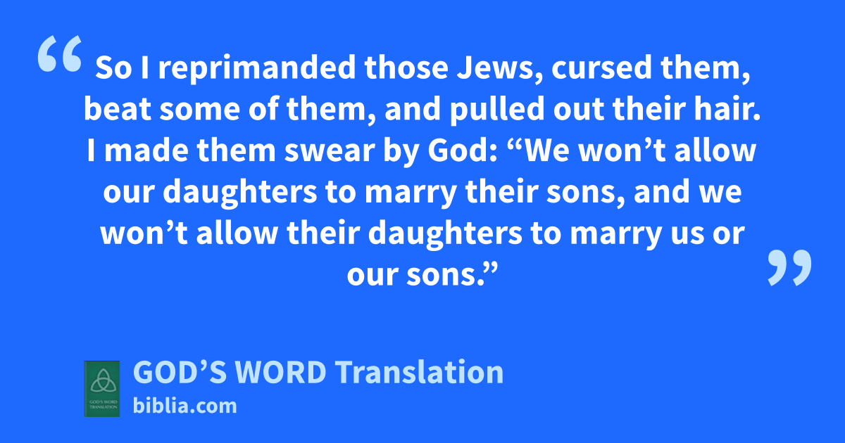 23 In those days I saw some Jews who had married women from Ashdod, Ammon, and Moab. 24 Half their children spoke the language of Ashdod or one of the other languages, but they couldn’t understand the language of Judah well enough to speak it. 25 So I reprimanded those Jews, cursed them, beat some of them, and pulled out their hair. I made them swear by God: “We won’t allow our daughters to marry their sons, and we won’t allow their daughters to marry us or our sons.” 26 I said, “Wasn’t it because of marriages like these that King Solomon of Israel sinned? There wasn’t a king like him among all nations. God loved him, and God made him king of all Israel. But his non-Israelite wives led him to sin. 27 Should we follow your example, commit such a serious crime against our God, and be unfaithful to him by marrying non-Israelite women?”