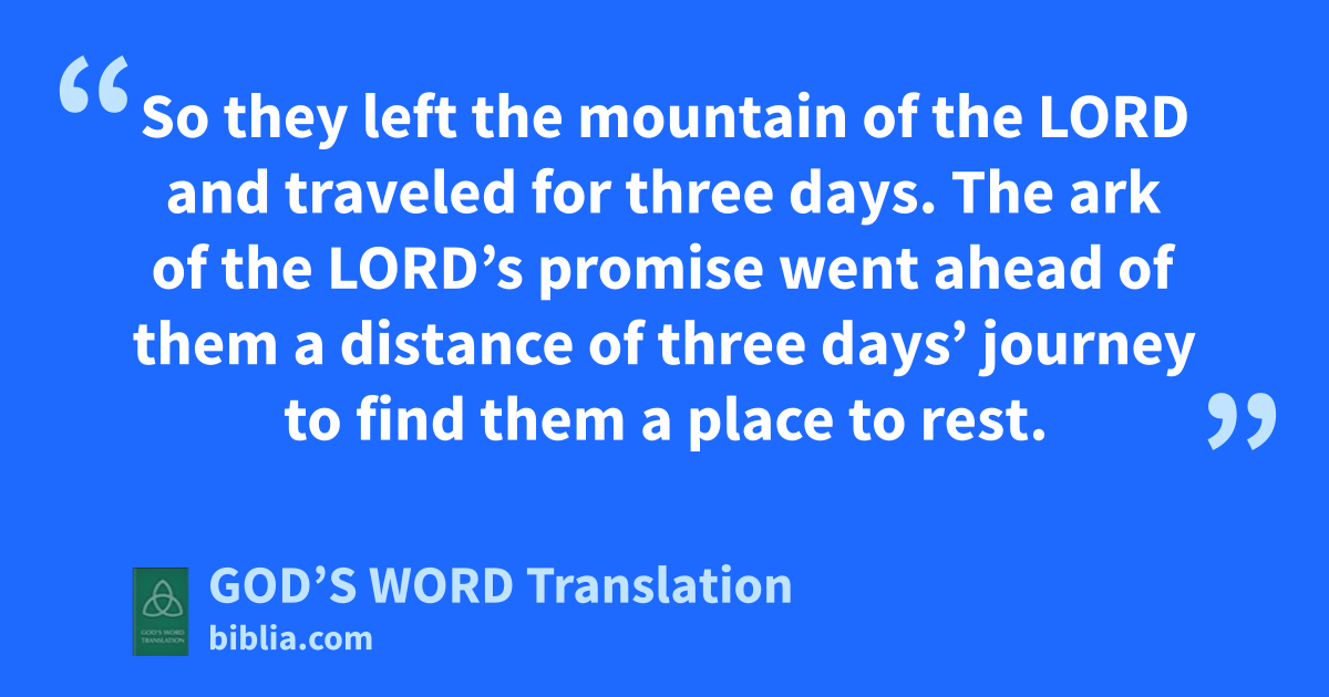33 So they left the mountain of the Lord and traveled for three days. The ark of the Lord’s promise went ahead of them a distance of three days’ journey to find them a place to rest. 34 The Lord’s ⸤column of⸥ smoke was over them by day when they moved the camp.