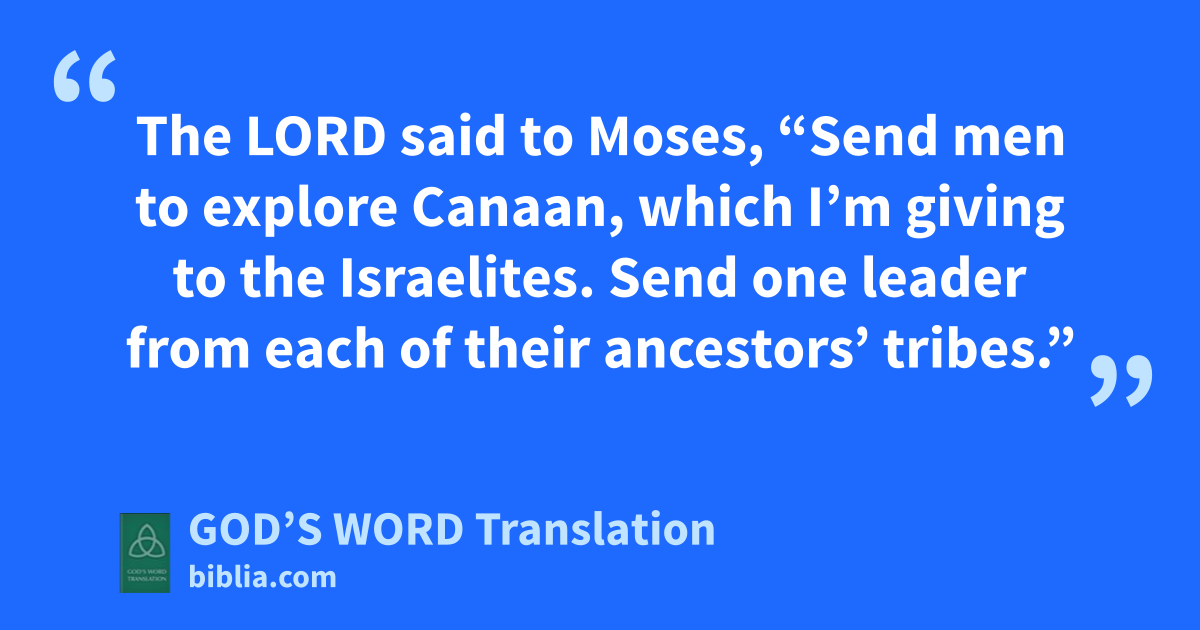 1 The Lord said to Moses, 2 “Send men to explore Canaan, which I’m giving to the Israelites. Send one leader from each of their ancestors’ tribes.”
