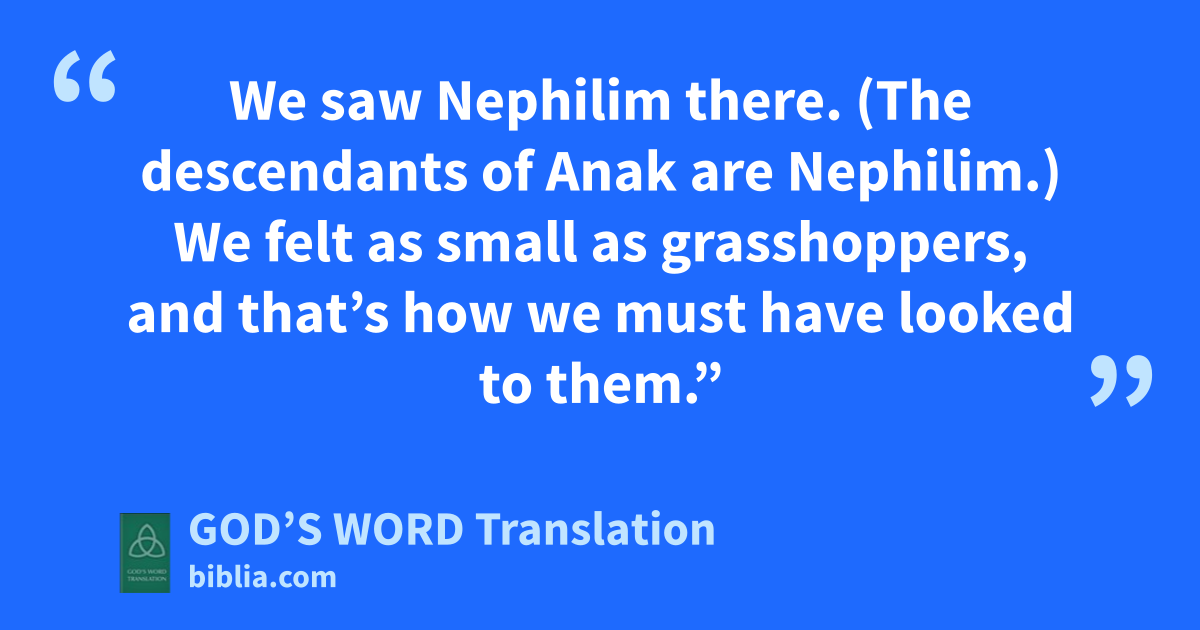 31 But the men who had gone with him said, “We can’t attack those people! They’re too strong for us!” 32 So they began to spread lies among the Israelites about the land they had explored. They said, “The land we explored is one that devours those who live there. All the people we saw there are very tall. 33 We saw Nephilim there. (The descendants of Anak are Nephilim.) We felt as small as grasshoppers, and that’s how we must have looked to them.”