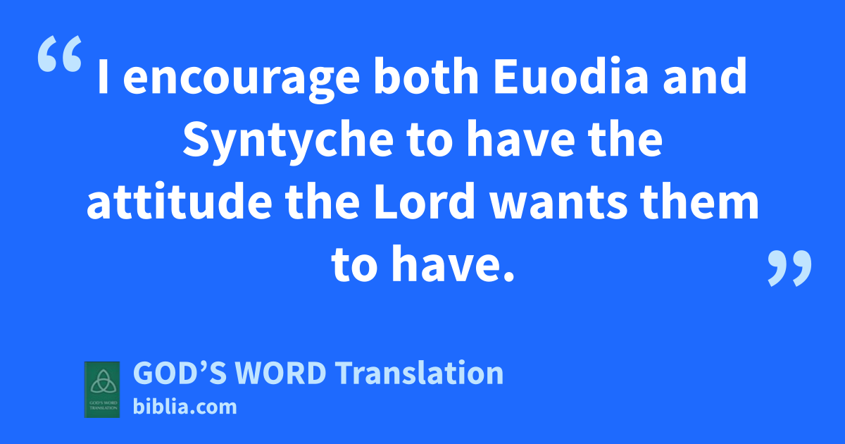 2 I encourage both Euodia and Syntyche to have the attitude the Lord wants them to have. 3 Yes, I also ask you, Syzugus, my true partner, to help these women. They fought beside me to spread the Good News along with Clement and the rest of my coworkers, whose names are in the Book of Life.