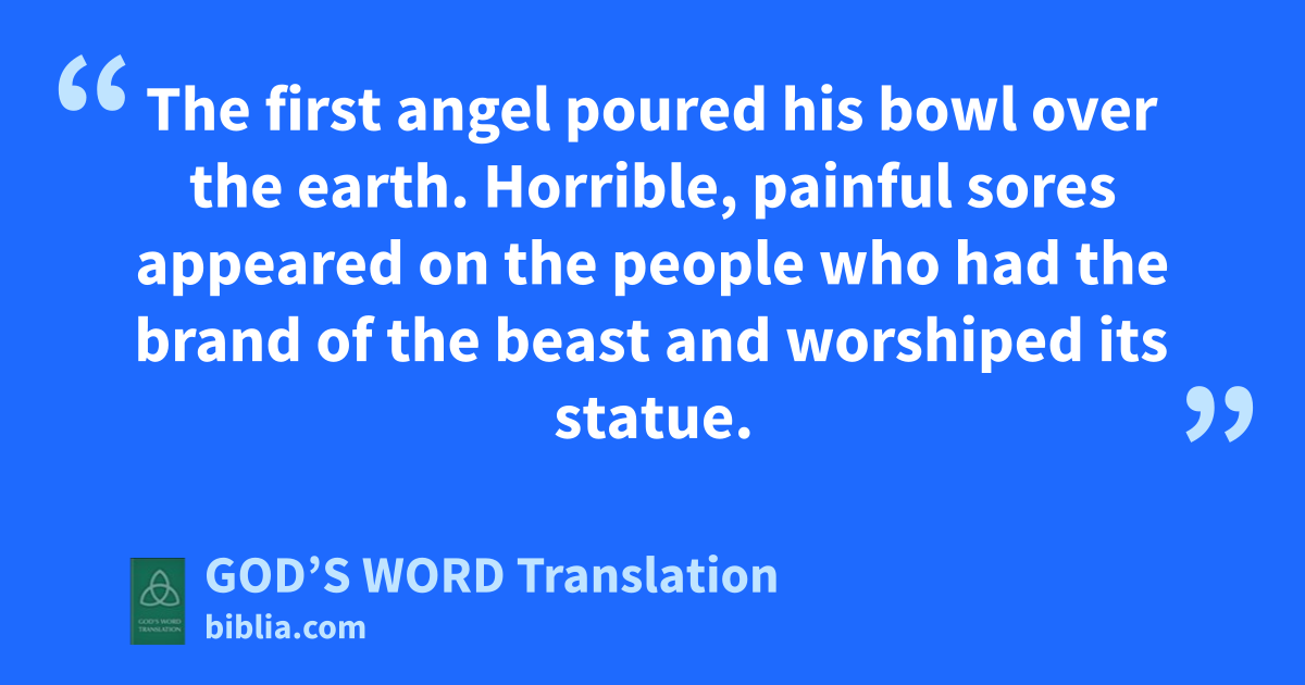 2 The first angel poured his bowl over the earth. Horrible, painful sores appeared on the people who had the brand of the beast and worshiped its statue.