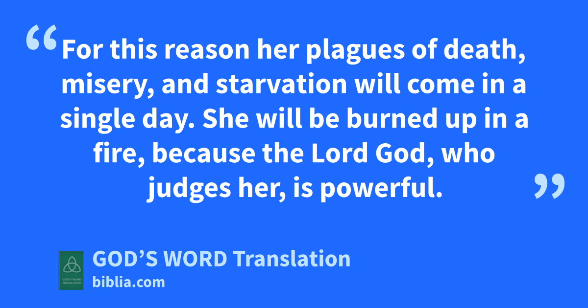 4 I heard another voice from heaven saying, “Come out of Babylon, my people, so that you do not participate in her sins and suffer from any of her plagues. 5 Her sins are piled as high as heaven, and God has remembered her crimes. 6 Do to her what she has done. Give her twice as much as she gave. Serve her a drink in her own cup twice as large as the drink she served others. 7 She gave herself glory and luxury. Now give her just as much torture and misery. She says to herself, ‘I’m a queen on a throne, not a widow. I’ll never be miserable.’ 8 For this reason her plagues of death, misery, and starvation will come in a single day. She will be burned up in a fire, because the Lord God, who judges her, is powerful.