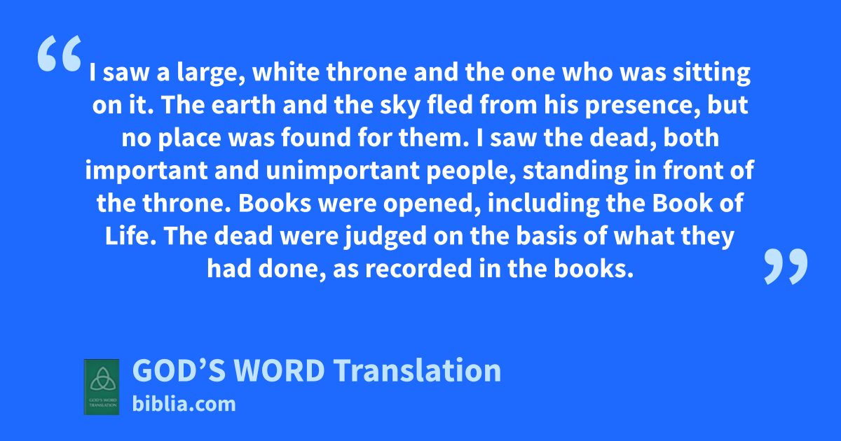 11 I saw a large, white throne and the one who was sitting on it. The earth and the sky fled from his presence, but no place was found for them. 12 I saw the dead, both important and unimportant people, standing in front of the throne. Books were opened, including the Book of Life. The dead were judged on the basis of what they had done, as recorded in the books. 13 The sea gave up its dead. Death and hell gave up their dead. People were judged based on what they had done. 14 Death and hell were thrown into the fiery lake. (The fiery lake is the second death.) 15 Those whose names were not found in the Book of Life were thrown into the fiery lake.