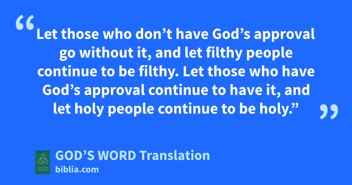 10 Then the angel said to me, “Don’t seal up the words of the prophecy in this book because the time is near. 11 Let those who don’t have God’s approval go without it, and let filthy people continue to be filthy. Let those who have God’s approval continue to have it, and let holy people continue to be holy.”