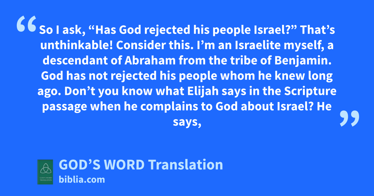 1 So I ask, “Has God rejected his people Israel?” That’s unthinkable! Consider this. I’m an Israelite myself, a descendant of Abraham from the tribe of Benjamin. 2 God has not rejected his people whom he knew long ago. Don’t you know what Elijah says in the Scripture passage when he complains to God about Israel? He says, 3 “Lord, they’ve killed your prophets and torn down your altars. I’m the only one left, and they’re trying to take my life.” 4 But what was God’s reply? God said, “I’ve kept 7,000 people for myself who have not knelt to worship Baal.” 5 So, as there were then, there are now a few left that God has chosen by his kindness.a 6 If they were chosen by God’s kindness, they weren’t chosen because of anything they did. Otherwise, God’s kindness wouldn’t be kindness.