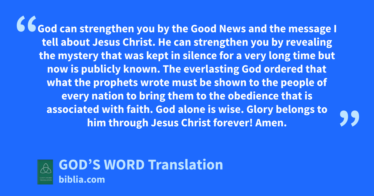 25 God can strengthen you by the Good News and the message I tell about Jesus Christ. He can strengthen you by revealing the mystery that was kept in silence for a very long time 26 but now is publicly known. The everlasting God ordered that what the prophets wrote must be shown to the people of every nation to bring them to the obedience that is associated with faith. 27 God alone is wise. Glory belongs to him through Jesus Christ forever! Amen.