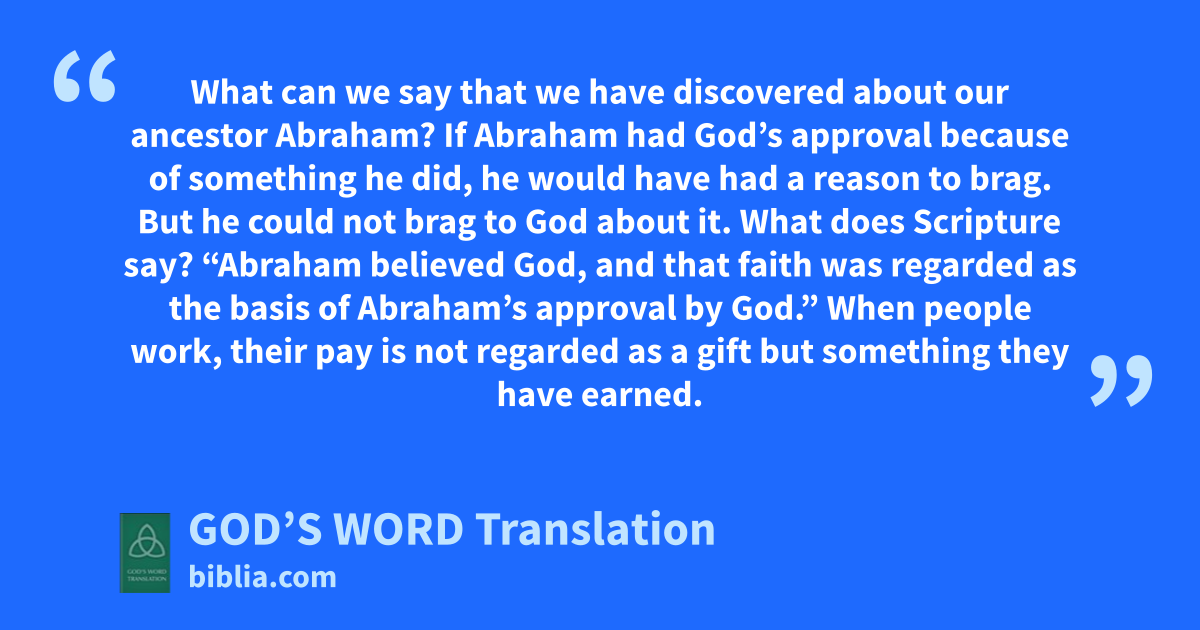 1 What can we say that we have discovered about our ancestor Abraham? 2 If Abraham had God’s approval because of something he did, he would have had a reason to brag. But he could not brag to God about it. 3 What does Scripture say? “Abraham believed God, and that faith was regarded as the basis of Abraham’s approval by God.”