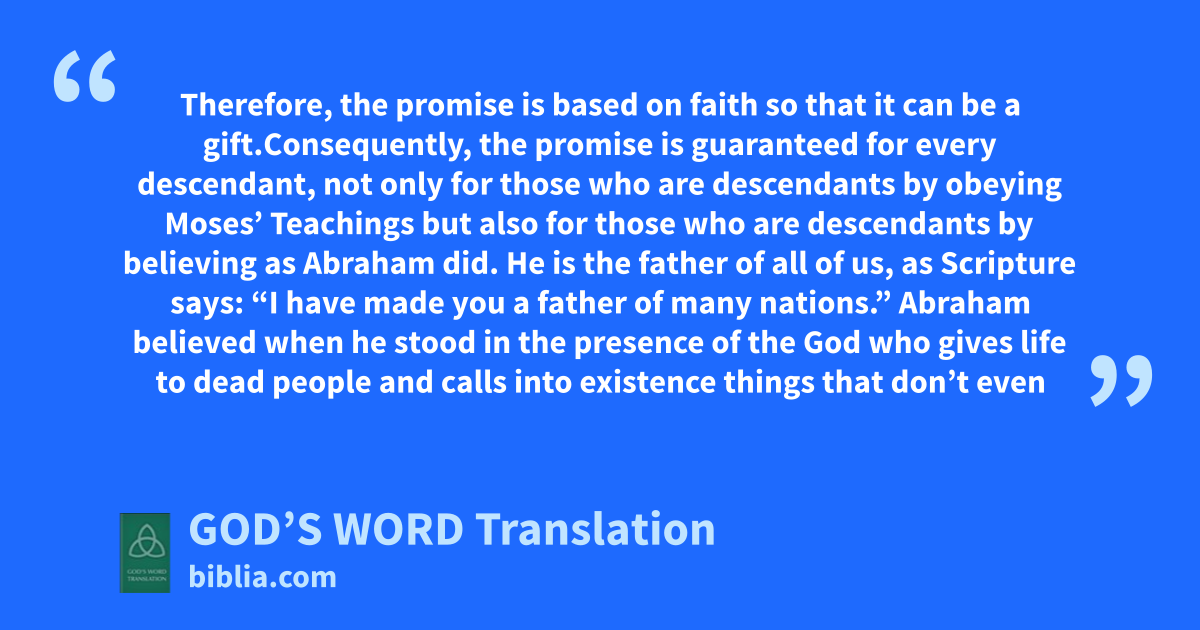 13 So it was not by obeying the laws in Moses’ Teachings that Abraham or his descendants received the promise that he would inherit the world. Rather, he received this promise through God’s approval that comes by faith. 14 If those who obey Moses’ Teachings are the heirs, then faith is useless and the promise is worthless. 15 The laws in Moses’ Teachings bring about anger. But where laws don’t exist, they can’t be broken. 16 Therefore, the promise is based on faith so that it can be a gift.a Consequently, the promise is guaranteed for every descendant, not only for those who are descendants by obeying Moses’ Teachings but also for those who are descendants by believing as Abraham did. He is the father of all of us, 17 as Scripture says: “I have made you a father of many nations.”