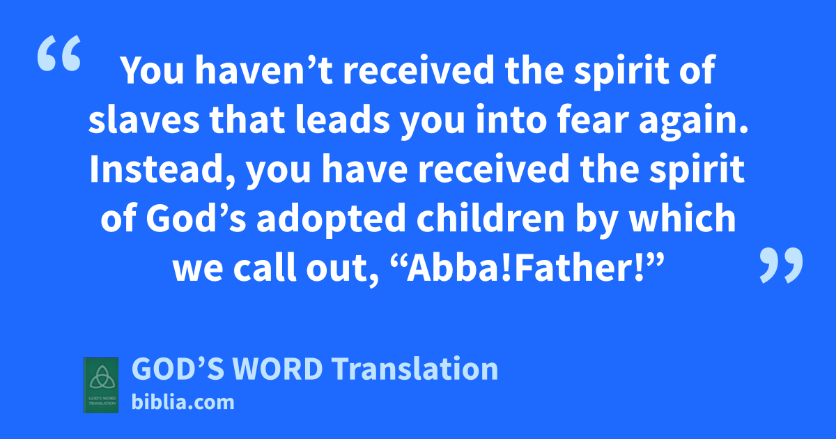 12 So, brothers and sisters, we have no obligation to live the way our corrupt nature wants us to live. 13 If you live by your corrupt nature, you are going to die. But if you use your spiritual nature to put to death the evil activities of the body, you will live. 14 Certainly, all who are guided by God’s Spirit are God’s children. 15 You haven’t received the spirit of slaves that leads you into fear again. Instead, you have received the spirit of God’s adopted children by which we call out, “Abba!a Father!” 16 The Spirit himself testifies with our spirit that we are God’s children. 17 If we are his children, we are also God’s heirs. If we share in Christ’s suffering in order to share his glory, we are heirs together with him.