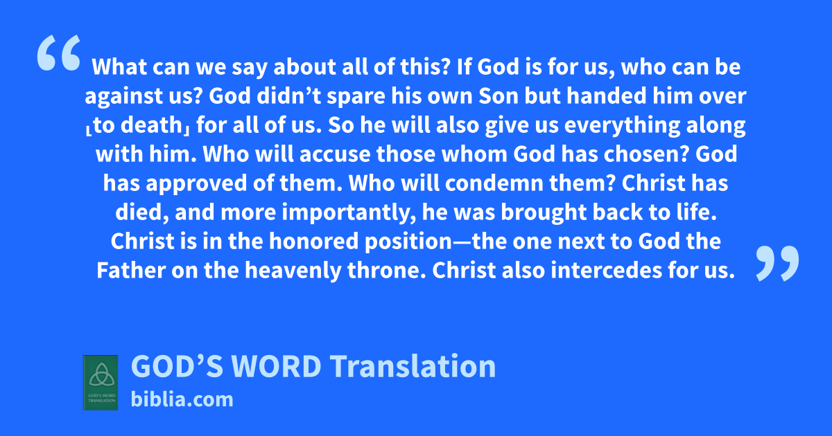 31 What can we say about all of this? If God is for us, who can be against us? 32 God didn’t spare his own Son but handed him over ⸤to death⸥ for all of us. So he will also give us everything along with him. 33 Who will accuse those whom God has chosen? God has approved of them. 34 Who will condemn them? Christ has died, and more importantly, he was brought back to life. Christ is in the honored position—the one next to God the Father on the heavenly throne. Christ also intercedes for us. 35 What will separate us from the love Christ has for us? Can trouble, distress, persecution, hunger, nakedness, danger, or violent death separate us from his love? 36 As Scripture says: