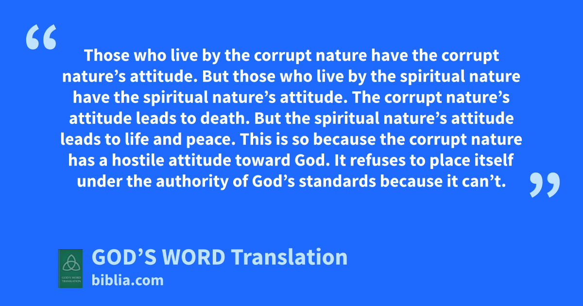5 Those who live by the corrupt nature have the corrupt nature’s attitude. But those who live by the spiritual nature have the spiritual nature’s attitude. 6 The corrupt nature’s attitude leads to death. But the spiritual nature’s attitude leads to life and peace. 7 This is so because the corrupt nature has a hostile attitude toward God. It refuses to place itself under the authority of God’s standards because it can’t. 8 Those who are under the control of the corrupt nature can’t please God. 9 But if God’s Spirit lives in you, you are under the control of your spiritual nature, not your corrupt nature.