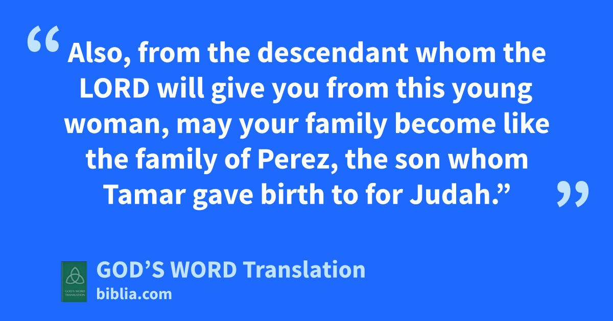 11 All the people who were at the gate, including the leaders, said, “We are witnesses. May the Lord make this wife, who is coming into your home, like Rachel and Leah, both of whom built our family of Israel. So show your strength of character in Ephrathah and make a name for yourself in Bethlehem. 12 Also, from the descendant whom the Lord will give you from this young woman, may your family become like the family of Perez, the son whom Tamar gave birth to for Judah.”