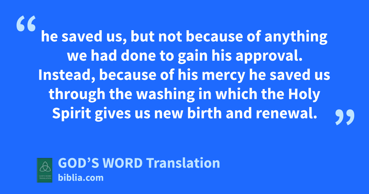 4 However, when God our Savior made his kindness and love for humanity appear, 5 he saved us, but not because of anything we had done to gain his approval. Instead, because of his mercy he saved us through the washing in which the Holy Spirit gives us new birth and renewal. 6 God poured a generous amount of the Spirit on us through Jesus Christ our Savior. 7 As a result, God in his kindnessa has given us his approval and we have become heirs who have the confidence that we have everlasting life. 8 This is a statement that can be trusted. I want you to insist on these things so that those who believe in God can concentrate on setting an example by doing good things. This is good and helps other people.